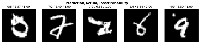 interp.plot_top_losses(5, nrows=1)