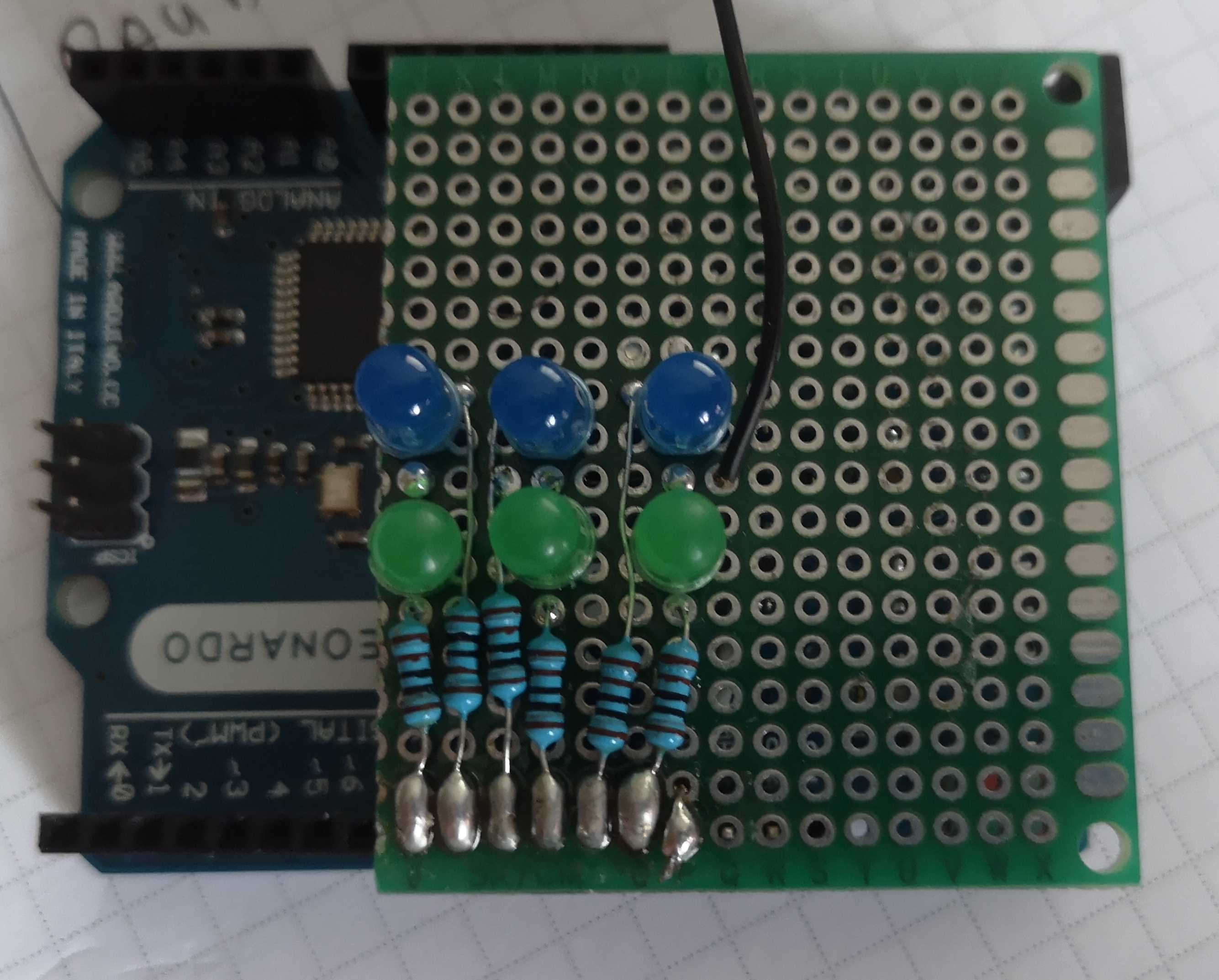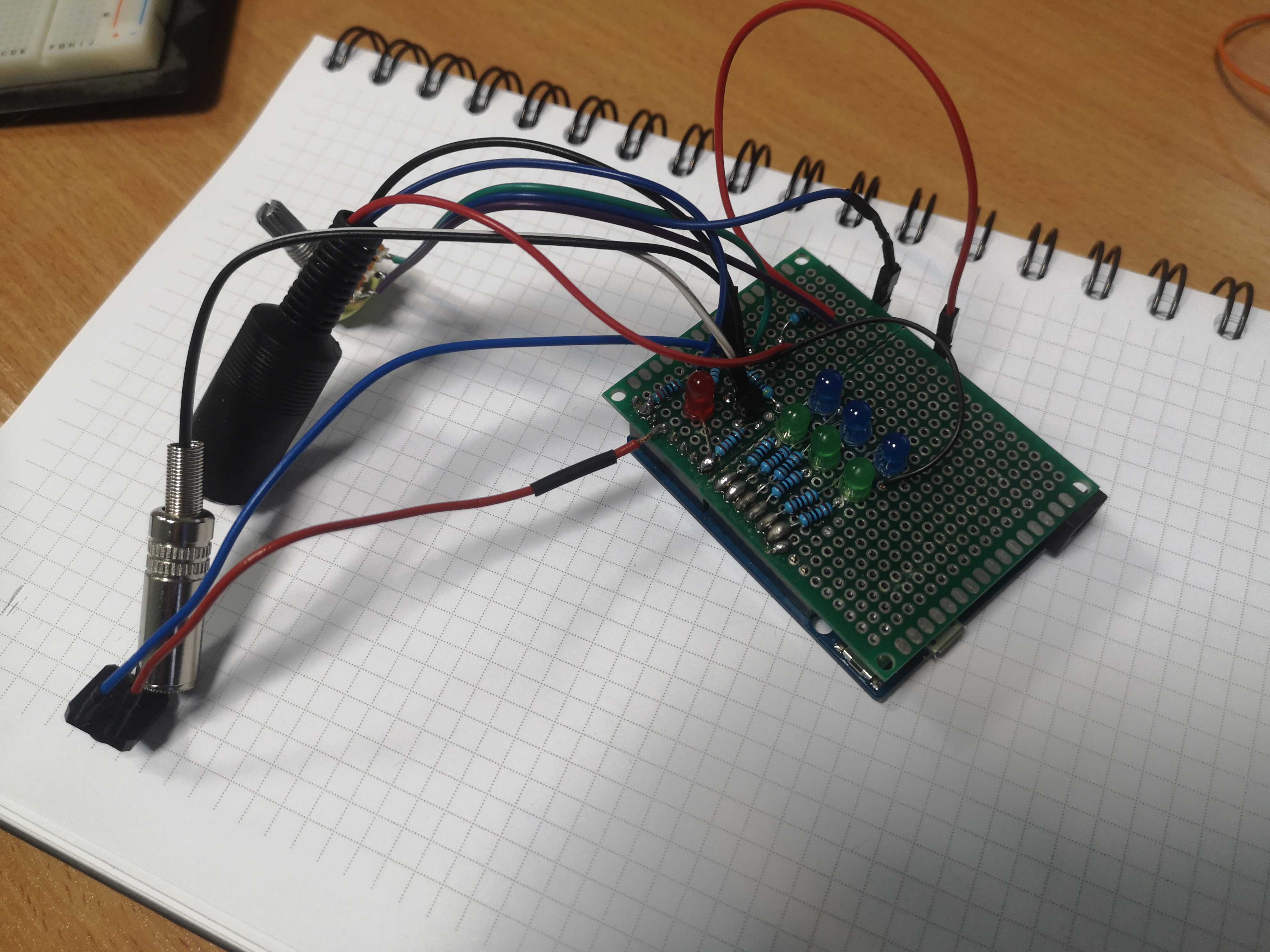 This was easy enough. I've started with the MIDIUSB Arduino library in the Arduino IDE and got it working within a day or so on a proto board. The circuit was super simple - just an arduino and 6 LEDs with resistors next to each of them. The code, likewise, just a busy loop reading MIDIUSB messages (see Section 4 here) on what's the header field in midiEventPacket_t means.). Of course, this isn't the most sophisticated beat indicator ever, as it just assumes that your time signature is 4/4. I've soldered the components onto a two sided proto board, remapped all the pins, as the physical layout turned out a bit weird, and that could have been it. But nooooo...